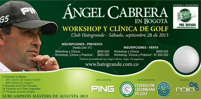 La estrella del golf latinoamericano y mundial Ángel Cabrera visitará Colombia para dar una clínica de golf en el Club Hato Grande Según información publicada por Fedegolf