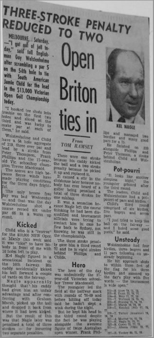 – “Liderando el abierto de Victoria en Australia en el año 1971, me tocó jugar en el último threesome con nada menos que Peter Thompson. (Peter William Thomson AO, CBE/ nacido el 23 de agosto 1929) es un golfista profesional australiano, recordado por ser el único junto a Tom Watson en haber ganado cinco veces el Open Championship.” [1] Thomson nació en Brunswick, Australia. Sus victorias en el Abierto Británico fueron en 1954, 1955, 1956, 1958, y 1965. Es el único en ganar el British Open durante tres años seguidos en el siglo 20.