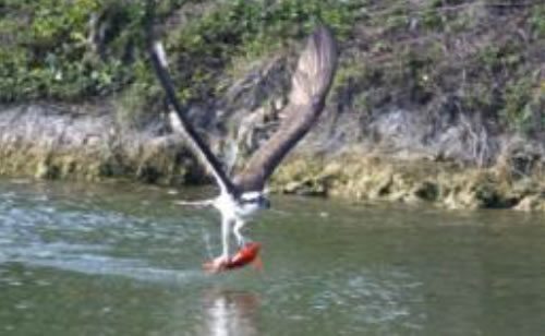 El águila pescadora mide 58 cm de la cabeza a la cola. Su envergadura (distancia entre los extremos de las alas), entre 152 y 167 cm. Las alas angulosas, en forma de M, se diferencian de las alas de los gallinazos (rectas). En cuanto al color: las alas son claras con castaño oscuro en los extremos y café́ por encima; la cabeza y el vientre son blancos; los ojos son de color naranja y los atraviesa una máscara oscura. Tiene un pico ganchudo y fuerte, y las garras…: ¡observe la foto e imagine el agarre!