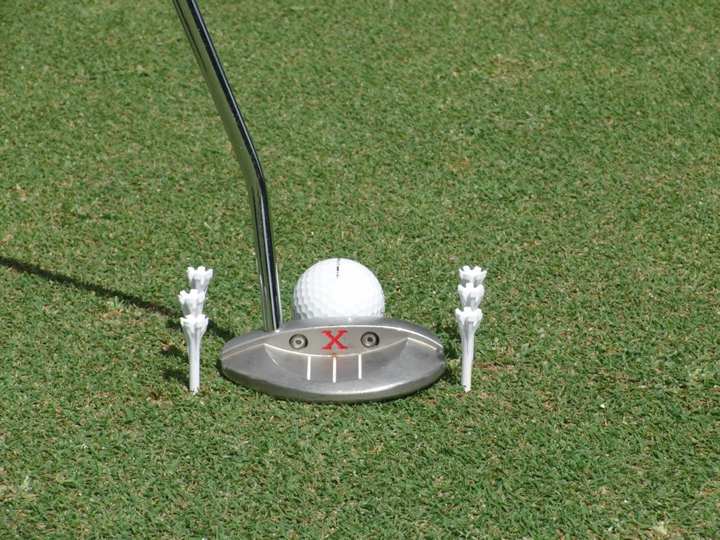 Todo putt tiene un punto óptimo de contacto con la pelota, por lo general el putt tiene un rayita o un punto en el tope que indica donde esta, si el jugador no contacta la pelota en esta parte de la cara del palo la velocidad a la cual sale la pelota es afectada, y por lo tanto, el jugador tendrá grandes problemas en controlar la distancia que rodara la pelota, y por ende, en leer correctamente la caída del putt, ya que la caída está directamente relacionada a la velocidad de la pelota. Un excelente ejercicio para mejorar pegarle a la pelota en el medio de la cara del putt es practicar con la pelota en el medio de un “túnel” de tees, tal y como se ve en la foto, si el putt no pasa sin tocar los tees entonces el jugador no hara contacto en el medio de la cara del putt.