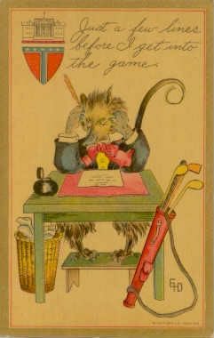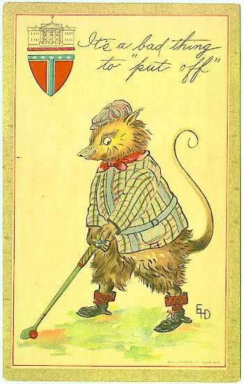 En el curso de la historia humana, algunas veces hay que tomar una posición, hay que manifestarse y esta puede ser una de ellas, pero curiosamente vemos al golf intervenir como instrumento de tregua y diversión ante cualquier rivalidad, incluso por la Casa Blanca. Durante la campaña presidencial de 1912 con Teddy Roosevelt uno de los candidatos, a Mr. Roosevelt se le conocía afectuosamente como Teddy Bear. En respuesta a eso, William Howard Taft le salió con Billy Possum, y su compañero de campaña, Jimmy Possum, y así de esta manera el buen nombre de la “Zarigüeya de Virginia” llegó a la bandera norteamericana. Realmente, Mr. Taft era usualmente conocido como el buen Billy.