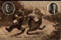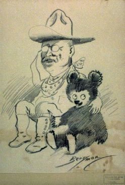 Por su parte, Roosevelt adquiere su sobrenombre de “Teddy” producto de un día de cacería con sus amigos, una golpeado un oso negro en la cabeza se opuso a que mataran al indefenso animal, cuya noticias coló en la prensa salieron una serie de caricaturas hablando de “Teddy” Roosevelt donde el oso comenzó a ponerse cada vez más pequeño, hasta que pasó a conocerse cono “Teddy Bear,” creciendo el concepto en popularidad casi instantáneamente y así fue lanzada la revolución Teddy Bear, luego que al mismo Teddy le gustara tanto la idea que decidió usarla para la Campaña Presidencial, incluyendo pines con el Teddy Bear.