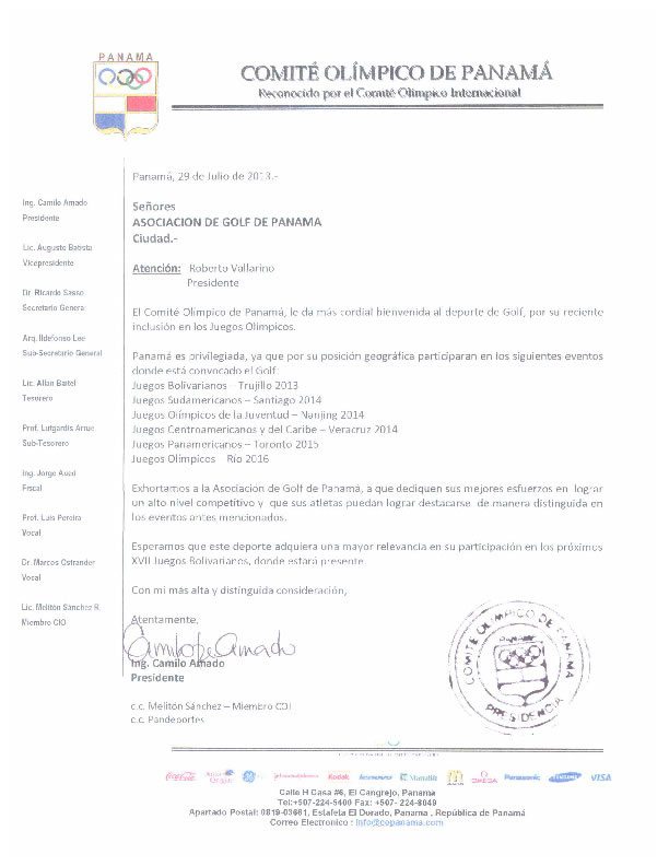 El pasado 29 de julio, la Asociación de Golf de Panamá (APAGOLF) recibió una carta del Comité Olímpico de Panamá (COP) dirigida al Sr. Roberto Vallarino, Presidente de esta institución deportiva panameña, por medio de la cual el Ing. Camilo Amado, Presidente del COP le da la bienvenida oficial al GOLF como deporte Olímpico, con copia a Pandeportes y Melitón Sánchez (Miembro del COI).