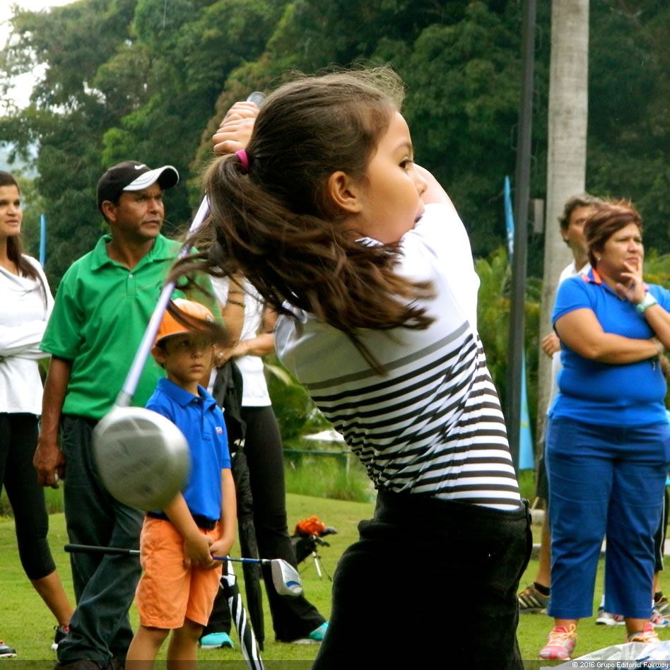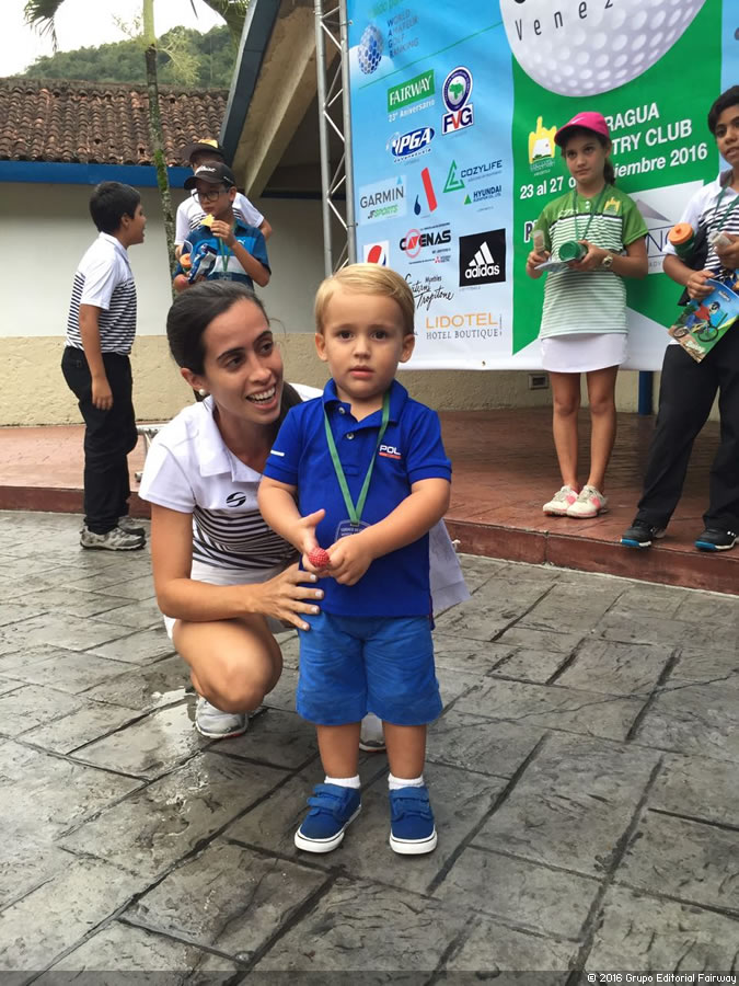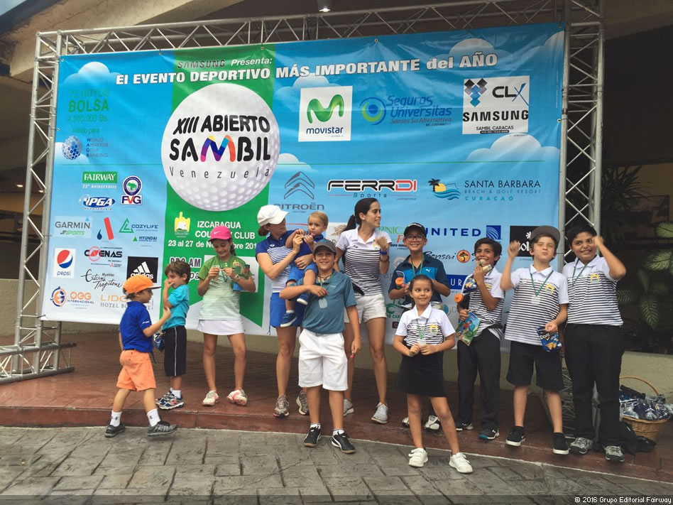 Caracas, 28 de Noviembre del 2016, (www.RevistaFairway.com).- Por tercer año consecutivo se realiza el sábado la importante actividad dedicada a los menores, por medio del novedoso y atractivo Drive, Chip & Putt, presentado este año por la Comisión de Golf Menor del Izcaragua Country Club en el marco del XIII Abierto Sambil presentado por Samsung, realizado en el área del Putting Green y Tee del Hoyo 1 del Izcaragua Country Club, con una participación de varias decenas de niños y niñas entre las edades de 5 y 13 años, acompañados de padres, abuelos y tíos, aunque también participaron algunos más grandes, en el caso de Luís Martínez del club anfitrión y Campeón Amateur del Abierto Sambil 2015, Eduardo Colmenares o Amauriel Fernández de la Fundación Izcaragua, éste último quien terminaría siendo el Campeón Amateur del Abierto Sambil 2016, exhibiendo cada quien sus cualidades y maravillando a los menores presentes, en un evento justamente creado para los más pequeños, creando todo un espectáculo con la intención de generar emociones, inspiración, concentración combinado con mucha diversión, lo que lo hace muy relajado, sin dejar de ser competitivo, basado en tres pruebas de habilidades, el Drive, el Chip y el Putt, todas tres altamente necesarias a la hora de jugar ya mayores en el nivel de alto rendimiento.