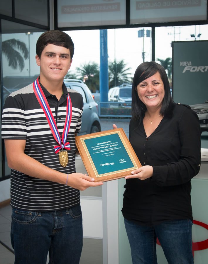 A su llegada a las instalaciones de Toyoriente, Pichu acompañado de su padre Jorge García y su madre Sara Catanese de García, estaba todo el grupo que labora en la empresa concesionaria esperando al nativo de Anaco, desde el Coordinador de Servicio Lorena Noria, Coordinador de Repuesto Petra Yegres, Post-Venta Adoración Uzcátegui, los Coordinadores de Administración Johana Viña y Rosula Segovia, los Técnicos Mecánicos, Asesores, Jefe de Taller, Vendedores de Repuestos, Almacenista y Atención al Cliente, cuando le entregaron una placa en reconocimiento al Campeón Mundial Jorge “Pichu” García por su destacada participación en el ‘Campeonato Mundial Juvenil de Golf Toyota 2013’ con respeto y admiración. Anaco, Julio 2013.