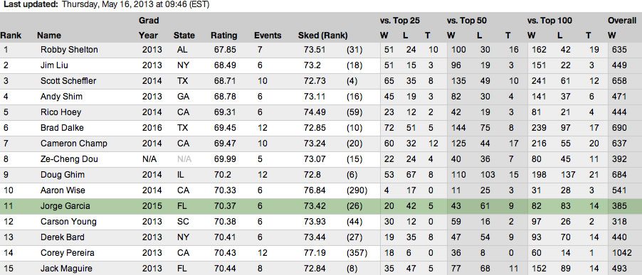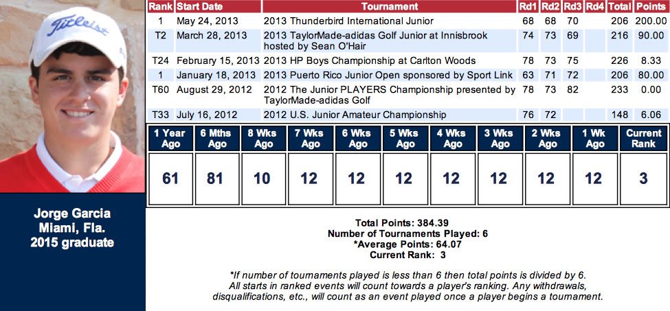 Lo más sorprendente de este joven nacido en Anaco, Estado Anzoátegui (Ven) alias “Pichu”, es que en lo que va de año ha participado en seis eventos AJGA, pero en los últimos cuatro del 2013 tiene, dos victorias, un segundo y 4 Top-25 (E24) con score promedio de 72.65 para ubicarse actualmente en el 3er lugar del Polo Golf Ranking, y en el puesto 11 del Golfweek-Titleist Junior Ranking (70.37 rating/ 6 eventos). El otro evento que García ganó fue el Puerto Rico Junior Open patrocinado por Sport Link y lo hizo con el mismo score de 206 (-10/ 63-71-72) que le significó 80 puntos para el Polo Ranking (AJGA) para ascender al puesto 10 en ese momento.