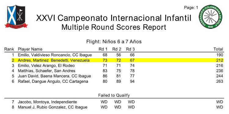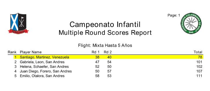 En primer lugar, Santiago Martínez de 4 años de edad quedó campeón de la categoría menores de 5 años, además de haber sido el participante más joven del torneo, con una tarjeta de 38-40=78. Por su parte, su hermano Andrés ocupó la segunda posición en la categoría de 6 y 7 años de edad con una tarjeta de 68-56-66= 190.